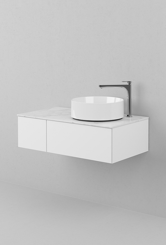 Med AIR skapar du din möbel helt från grunden. Varianten med ett tvättställ finns i bredderna 60–150 cm. Kombinera breda och smala förvaringslådor, samtliga överfalsade med mjukstängande push som standard. Montera din AIR på väggen för en svävande känsla eller välj benställning med handdukshylla i vit eller svart (90–120 cm). Välj mellan flera färger och material.